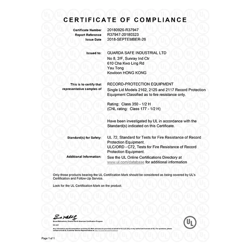 With strong R&D, Guarda holds multiple patents in the PRC, as well as overseas, ranging from invention patents to utility and design patents of all kind on our line of fireproof safe technology. Guarda is a designated High-Tech Enterprise in the PRC. Guarda manufactures to the highest standards and is an UL certified manufacturer. Our designs are aimed at providing consumers with practical and user friendly design that offers the desired protection.